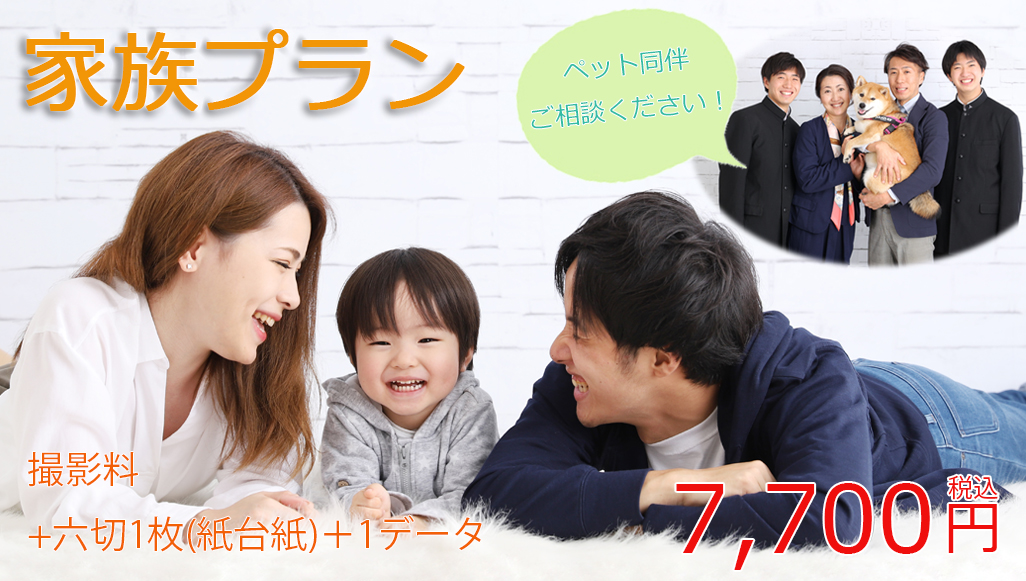 ご家族様写真1ポーズのみの撮影で、六切プリント1枚+データ1カットがついてくるお得なプラン。
